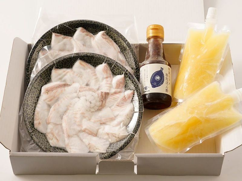 伸東ヒラメの刺身と、専用ヒラメ出汁、専用ポン酢のセット。しゃぶしゃぶの後に作る雑炊が絶品。