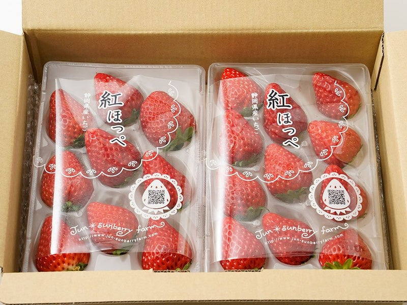 静岡県生まれのいちご「紅ほっぺ」。お届けするジュン・サンベリーファームの紅ほっぺは、寒さに耐えじっくり甘みを蓄えた完熟苺のみを厳選してお届け、とっても濃厚な甘みがあります。