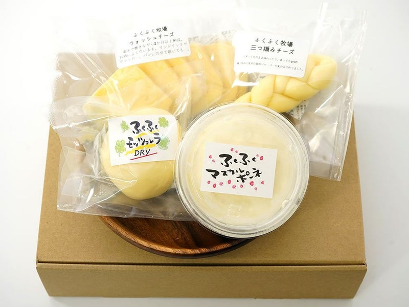 ウォッシュチーズ(50gか100g)、モッツァレラセミドライ(80g)、マスカルポーネ(100g)、三つ編み(30g)