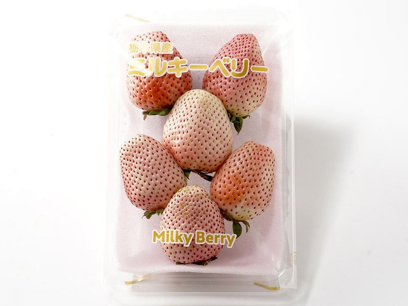栃木生まれの白い果皮が特徴の希少品種「ミルキーベリー」。酸味が非常に少なく、ミルクのようなやさしい甘さが広がります。