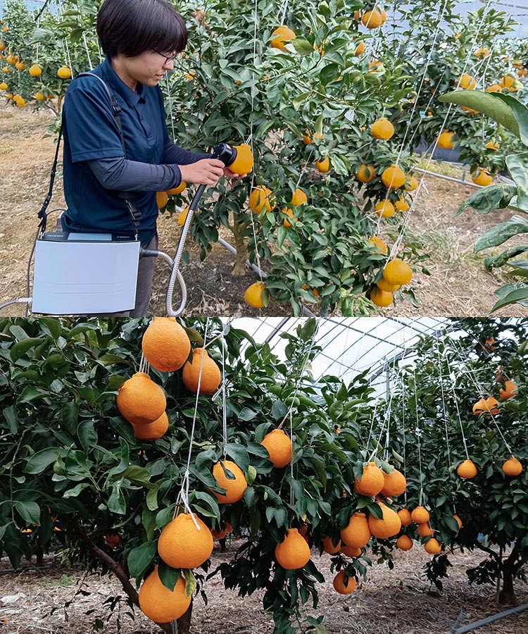 倉田農園では収穫3か月前から土壌水分計で水分管理を行い、糖度上昇の環境を設計。低樹高に改植し、果実全体に光が行き渡るようにすることで、甘みと香りを最大化します。