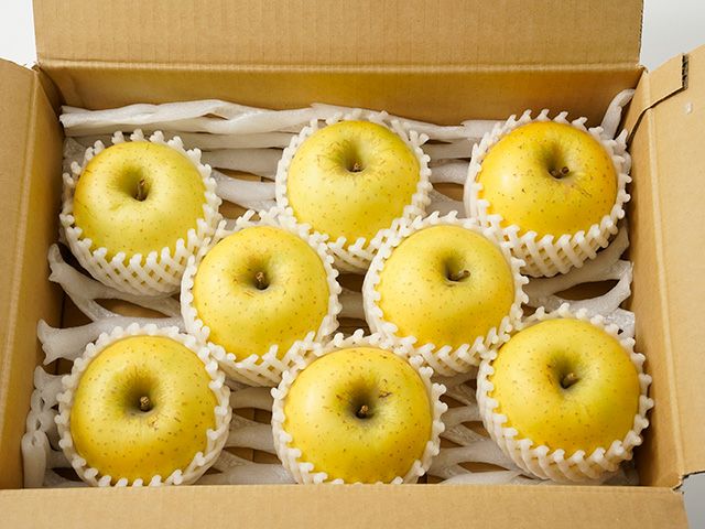 締まりの果肉でサクサクとした食感が楽しめます。果皮が黄色のりんご。甘味の中にしっかりとした酸味を感じることができます。固めの果肉で貯蔵性が良く、収穫後も冷蔵保存して発送しています。寝かせることで酸味がマイルドになり、年明けには甘味がしっかり感じられる状態になっています。