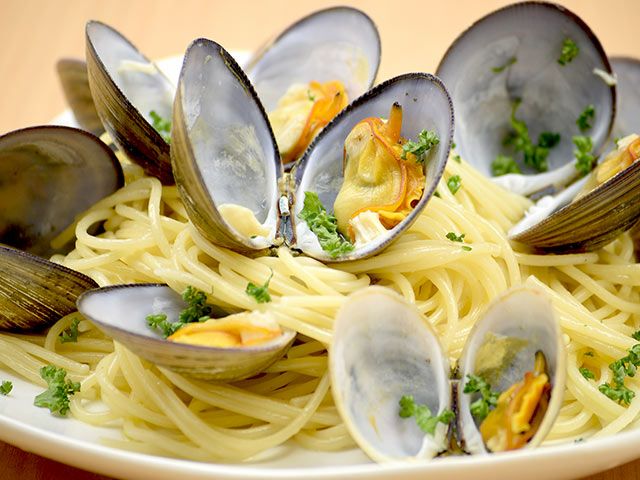 ③貝の口が開いたら、茹であがったパスタと適量の茹で汁を加え、塩コショウで味を調えて出来上がりです。